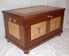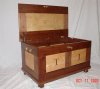 The chest is framed in black walnut and tied together with hard maple panels and black walnut accents. The initials 'T' and 'J' are inlayed in the front panels using the black walnut.